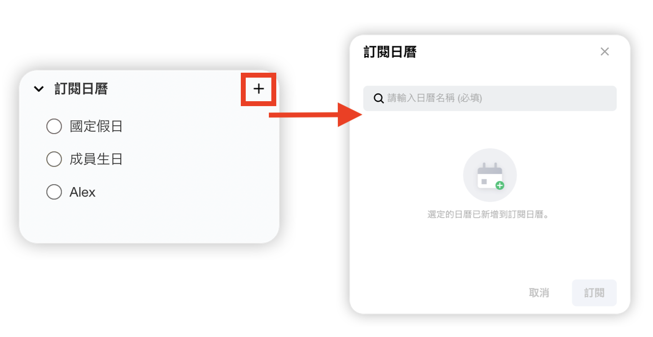 • 訂閱日曆 [+] -> 選擇想要訂閱的成員日曆 -> 訂閱