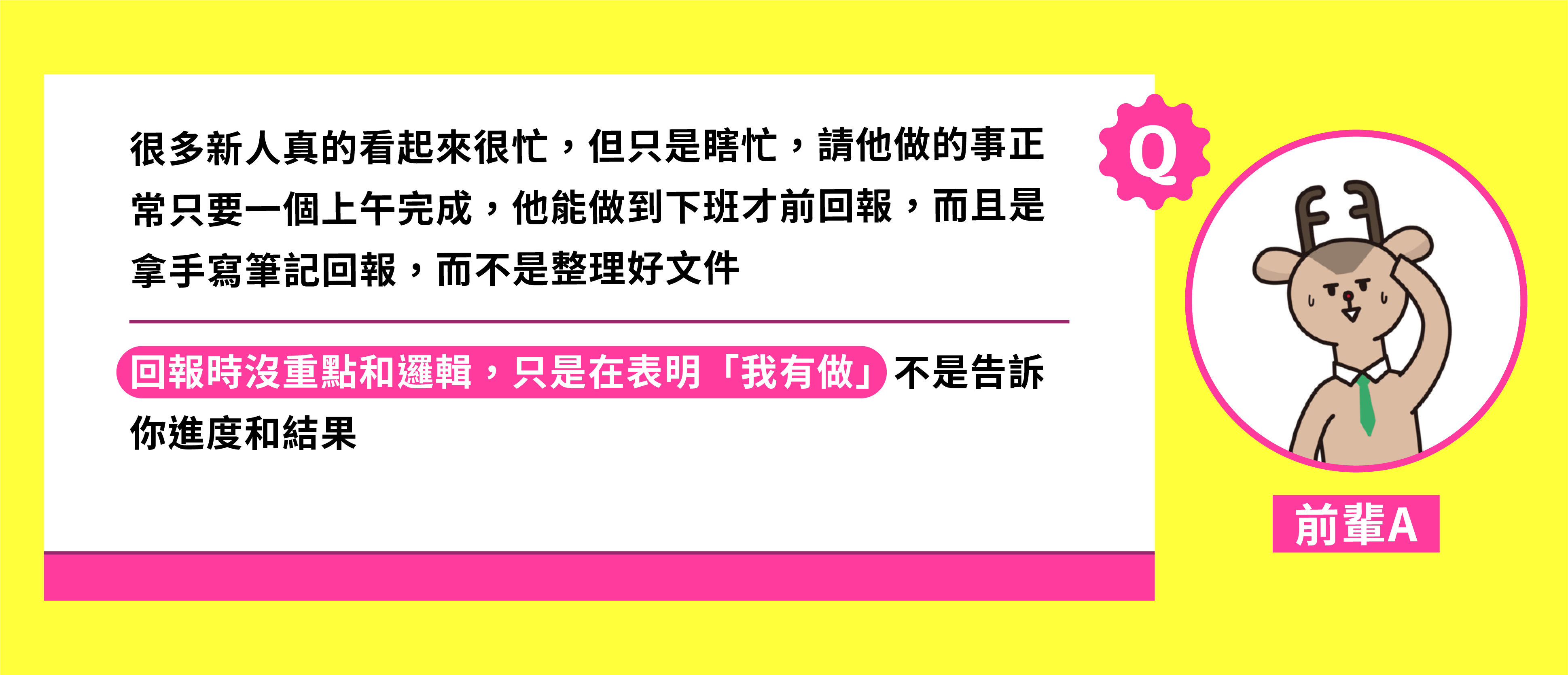 乍看可能會覺得麻煩,但有時為了節省必要的溝通,往往就會衍生後續更多時間在溝通。因此在帶新人的時候,應該先示範對方若要發問,或是回報進度,應該可以怎麼做,讓雙方都能快速掌握對方的想法。