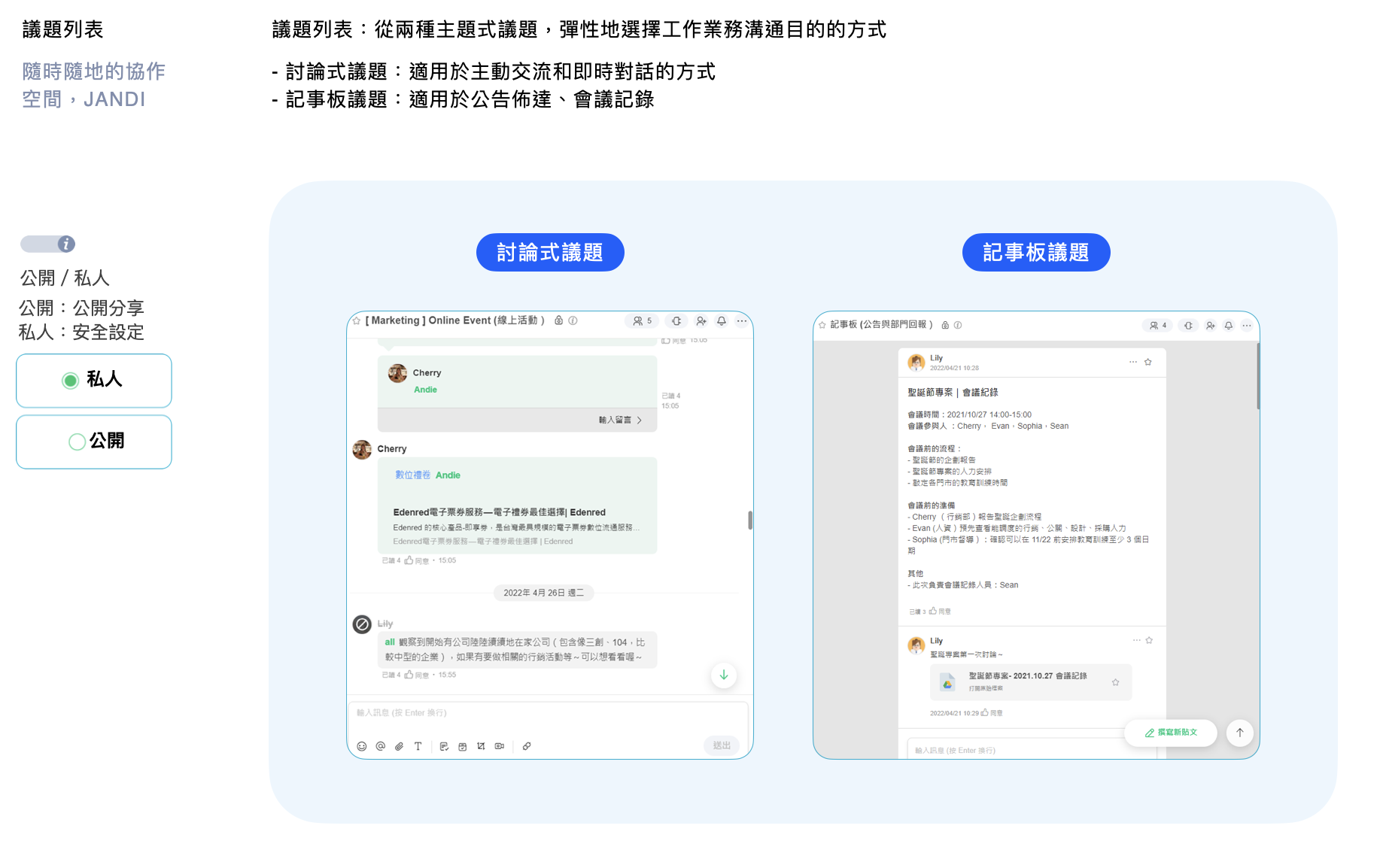 從新人到老鳥,每個人都曾經歷過初到職場的陌生,以及晉身主管後從新人身上看到自己當年的影子。不論前輩與新人所遇到的難題,都可以嘗試跟組織溝通,透過JANDI找到可行的使用方案與情境,讓協作與溝通步上軌道,消弭不同立場所產生的隔閡。