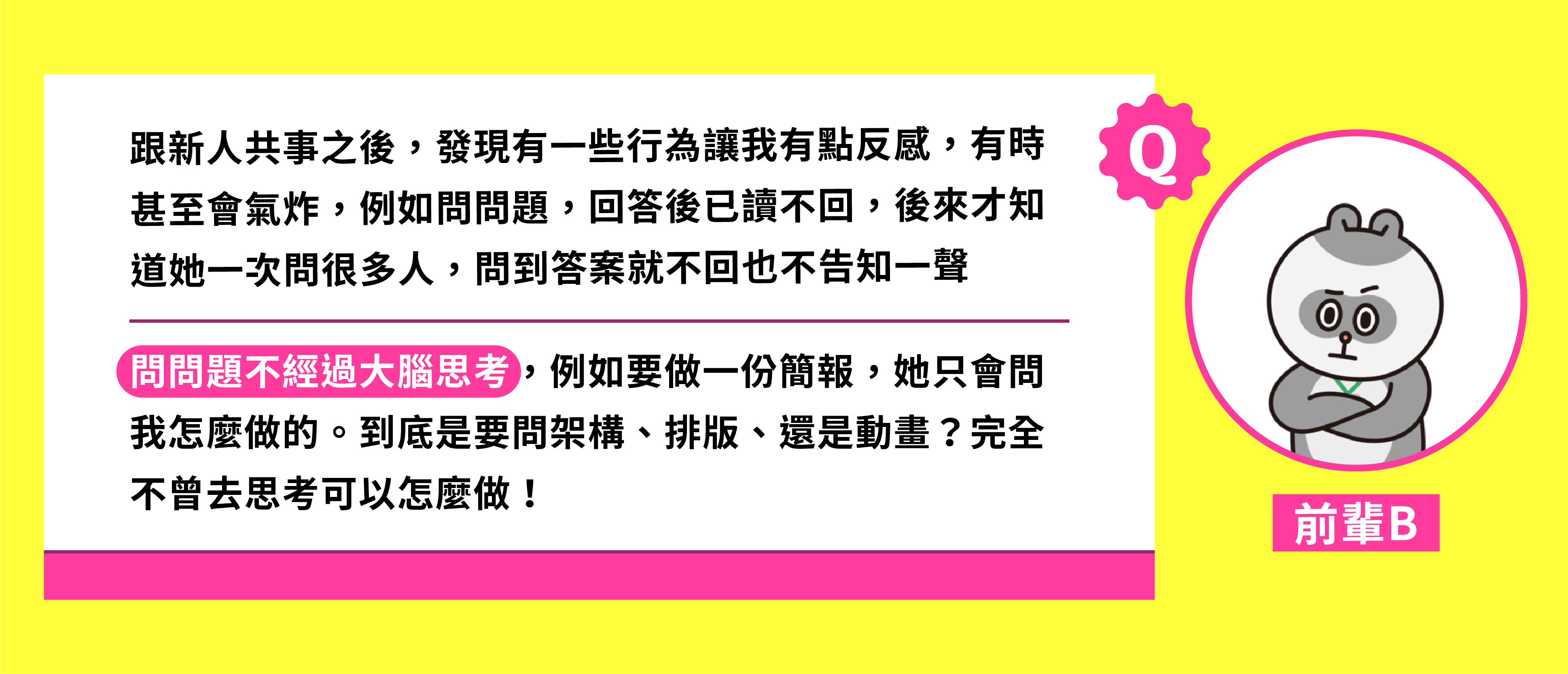 乍看可能會覺得麻煩,但有時為了節省必要的溝通,往往就會衍生後續更多時間在溝通。因此在帶新人的時候,應該先示範對方若要發問,或是回報進度,應該可以怎麼做,讓雙方都能快速掌握對方的想法。