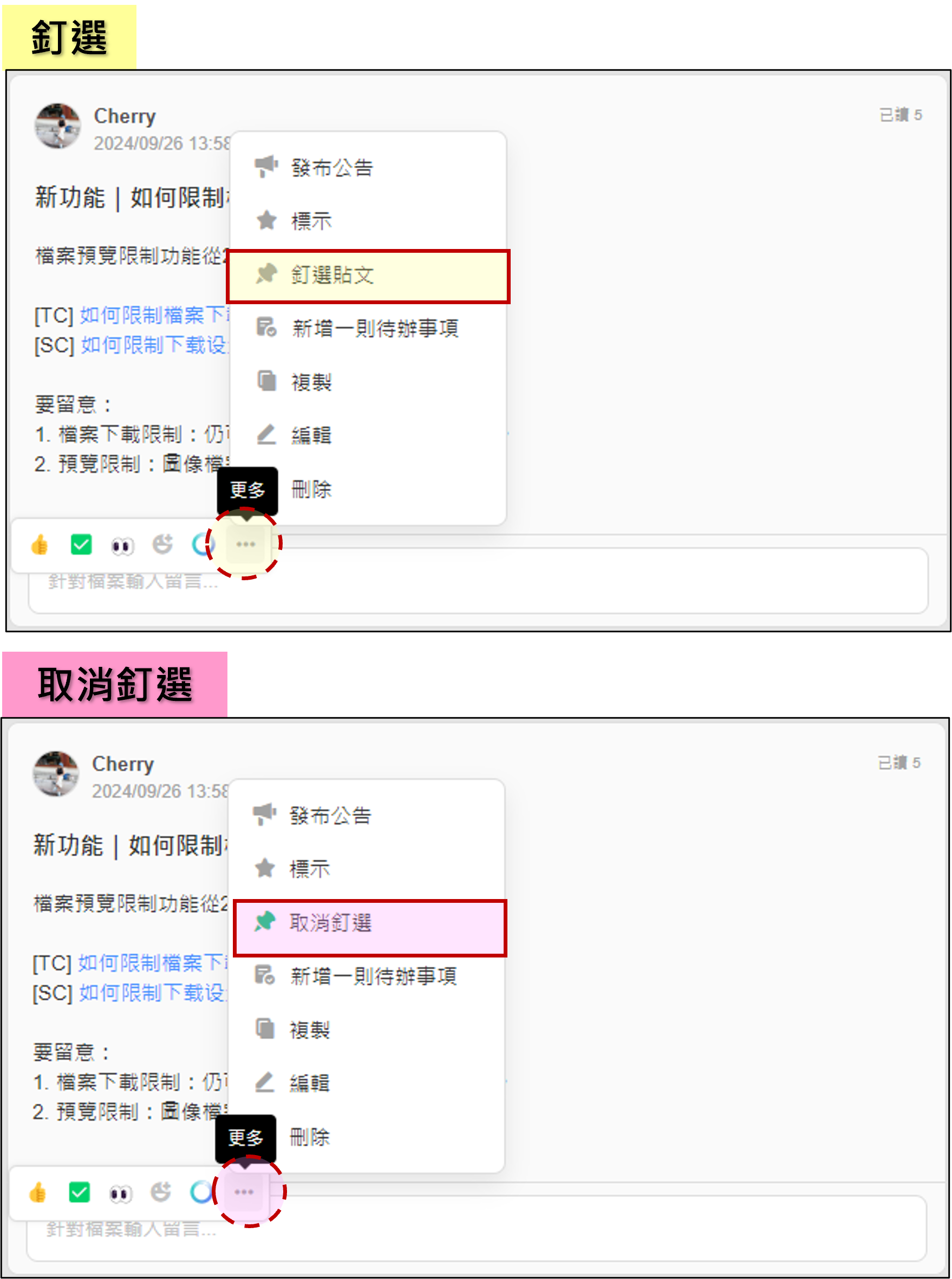 📍請留意:限議題管理員、團隊所有者和團隊管理員可以使用釘選/取消釘選功能。