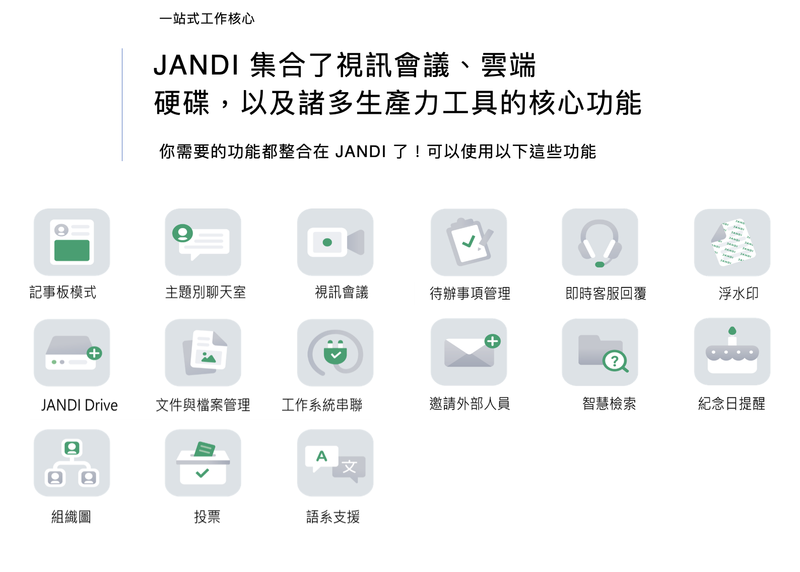 所以想要在工作的流程之中,可以在同一個通訊軟體平台,無痛切換工作議題,所有對話紀錄內容也可以精準搜尋到,這些都是 JANDI 可以提供的協助面向。