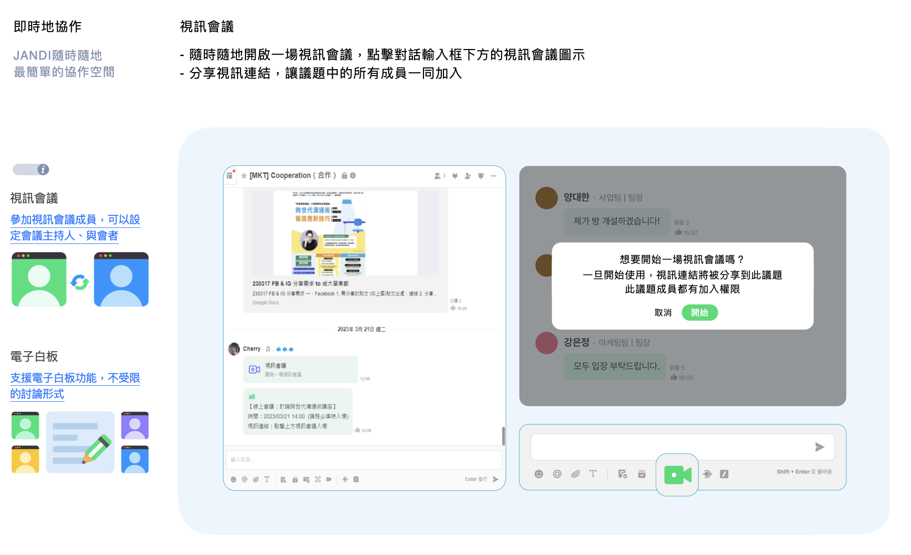 特別是其他公司也想跟 NVIDIA 學習,把會議大門隨時敞開,在其他國家、城市辦公,以及不在辦公室的成員,該怎麼遠距參加?這就得提到,JANDI 的 ENTERPRISE 方案提供無上限人數參加視訊會議的功能,讓遠距辦公,或是會議室位置有限的狀況之下,都能讓全員毫無距離,一起在會議上暢所欲言。