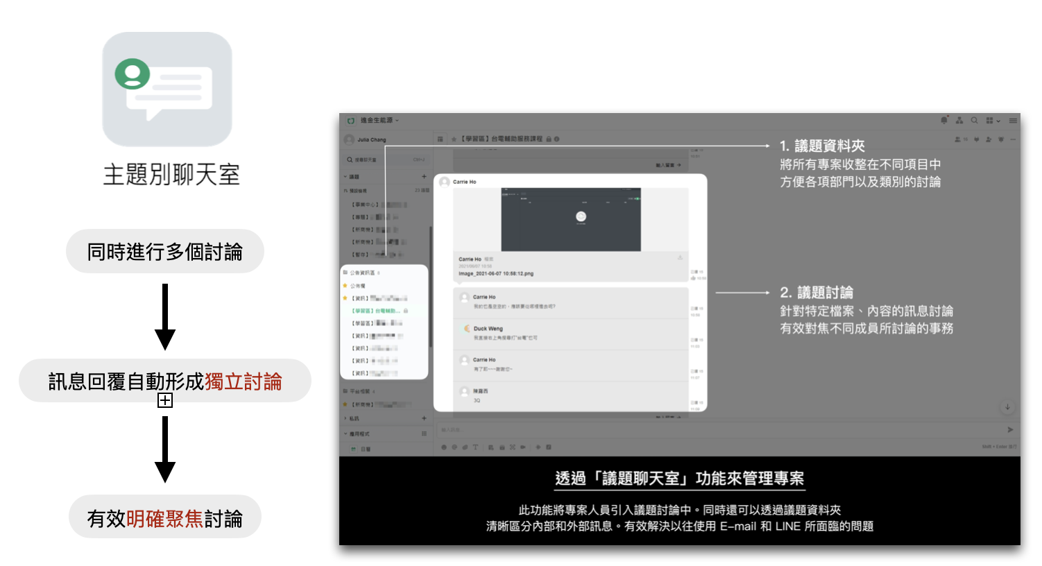 這種討論情境背後的運作邏輯,就相當類似 JANDI 主題別聊天室的「議題」功能,屬於一種可以迅速集合成員,達到集思廣益討論、有效追蹤進度、專案完成後,就可以解散的有機體群組。