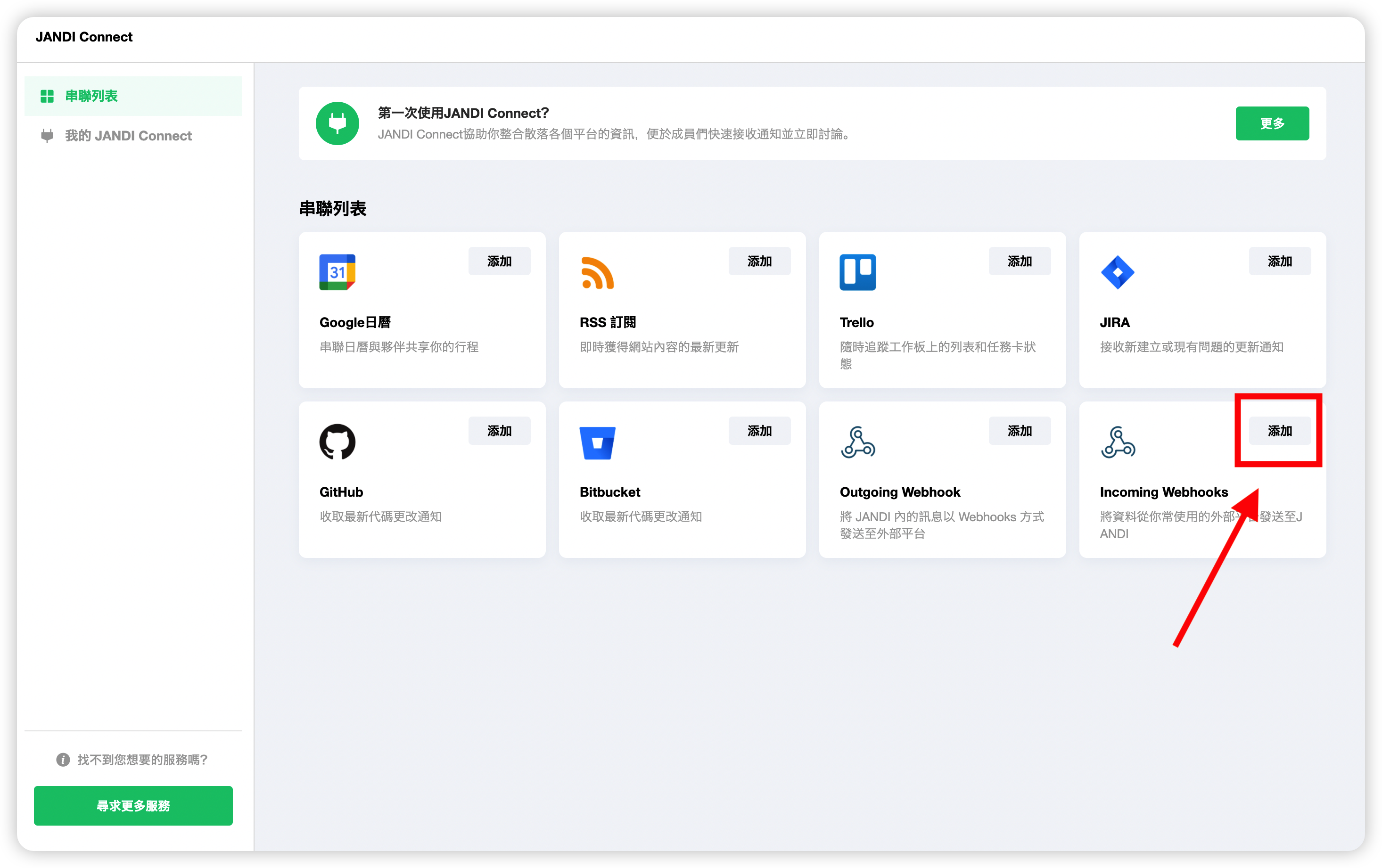 1-3) 點擊『添加整合』儲存以建立 JANDI Connect