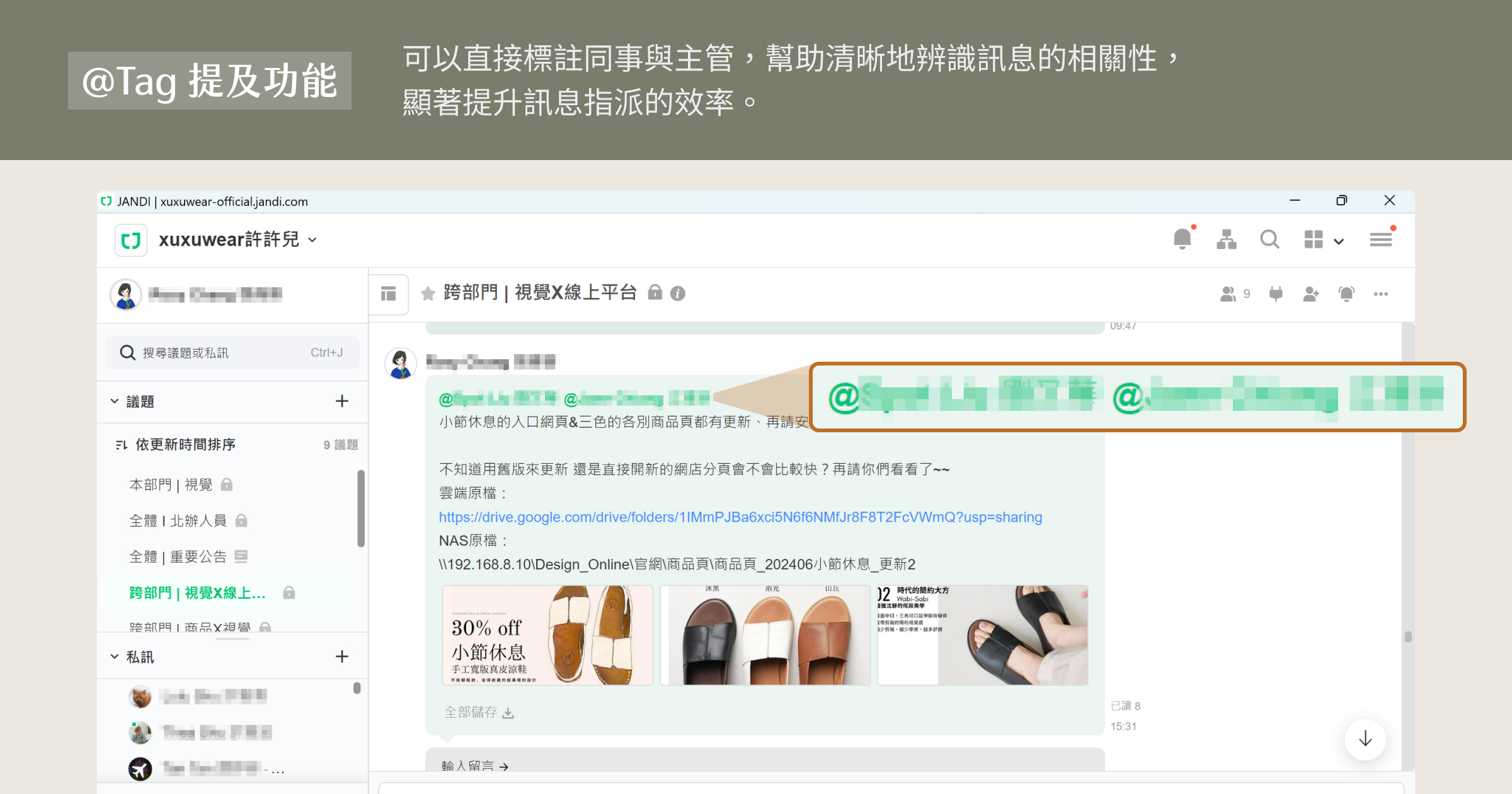 每個工作任務所需的時間、人力就能搭配 JANDI 的 Tag@ 指派功能,透過可視化流程,讓每位成員知道哪個時間點該做哪些事情、哪個截止日需要驗收成果,讓員工計算每個工作項目可能要花多少時間來分配,避免把工作留到最後一刻產生帕金森定律。