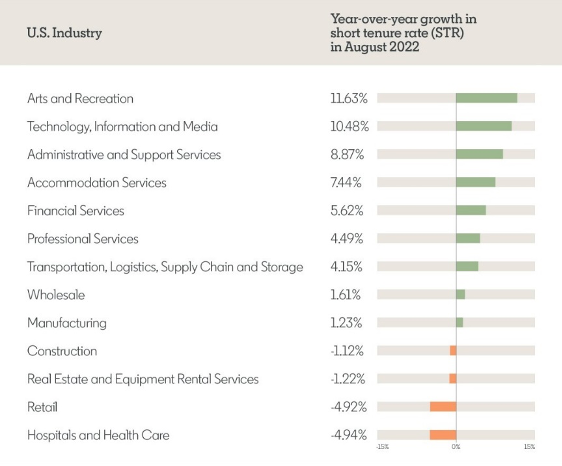 LinkedIn 對快速離職的定義,使用「短期任職率 STR」指標,所謂STR指的是不到一年的職位所佔比例。LinkedIn 就發現,2022 年美國多個產業的 STR,都比過去同期的基數增加,顯見員工在同一分工作不到一年的離職速度,相較前一年有所提升。
