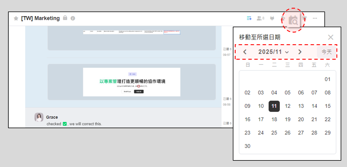 ✔️ 日期最早可追溯至該議題的建立日期,因此也可以跳轉到對話建立的第一天。
