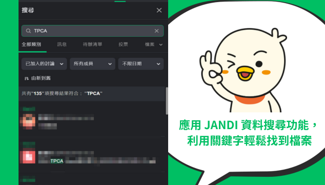 事後若要回溯找檔案,也可以用 JANDI 的搜尋功能,以檔名關鍵字在議題內搜索,快速找到對應的檔案,再提供給主管或跨部門同仁。如果是要把檔案傳送給外部廠商,陳淑芳提到他們會利用1:1私訊,先儲存檔案在跟同事之間的一對一對話,再把檔案以跨平台方式傳送給外部廠商。