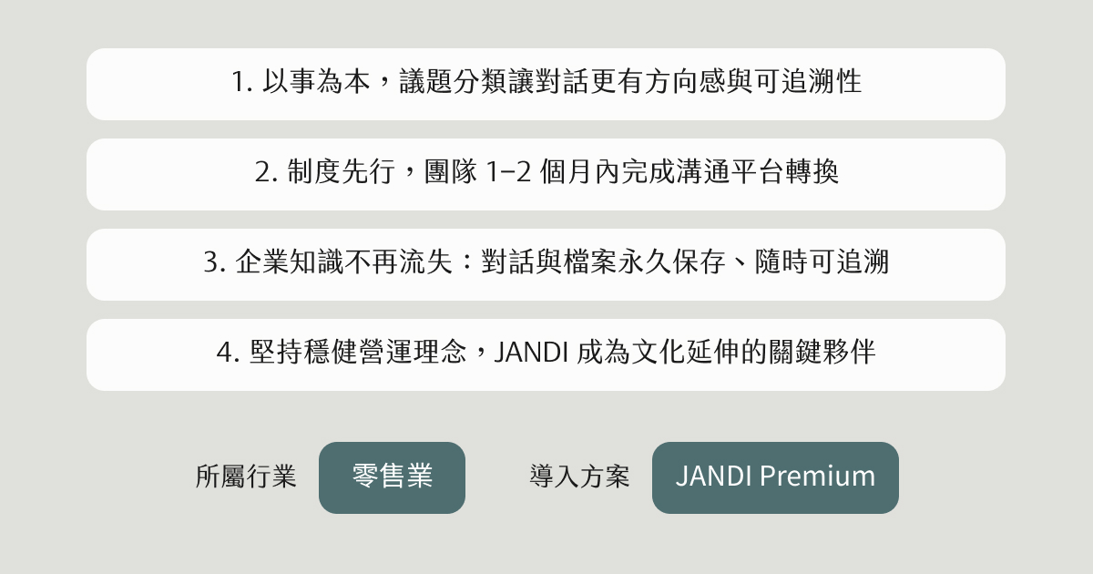 內部成員可若在評估多款市面上的協作工具後發現,JANDI 的操作邏輯更貼近台灣使用者習慣。介面清楚、訊息與檔案永久保存,議題分類明確,有效解決了過往遇到的訊息洗版、檔案遺失與公私難分等困擾。