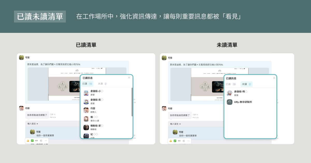 透過進階設定中的「已讀未讀清單」,不僅協助管理層追蹤訊息接收狀況,更推動全體成員帶著責任感閱讀公司訊息,清單式視覺化的呈現有效強化資訊傳遞的即時性與可控性,確保每一則重要資訊都沒有被忽略。對 Uffy 而言,這不只是工具升級,而是一場從資訊管理到文化意識的全面提升,為企業的高效與穩定運作打下堅實根基。