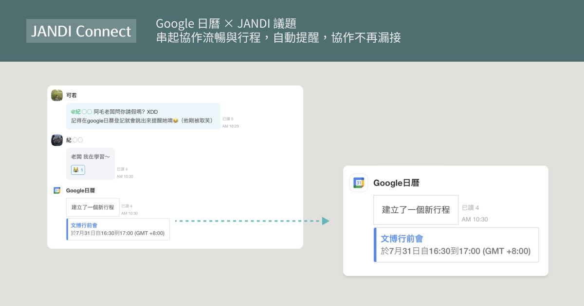 Derek 特別喜歡這個功能,他指出,當同事請假、外出或有其他排定行程時,JANDI 會在每周一自動彈出行事曆提醒,讓所有成員一目了然。有了這項功能,可減少過去需手動告知的麻煩,也避免因為不知道某位同事今天不在,而白白耽誤原本預定的工作討論或任務協作,Uffy 認為是串起協作流暢與組織透明的重要橋梁。