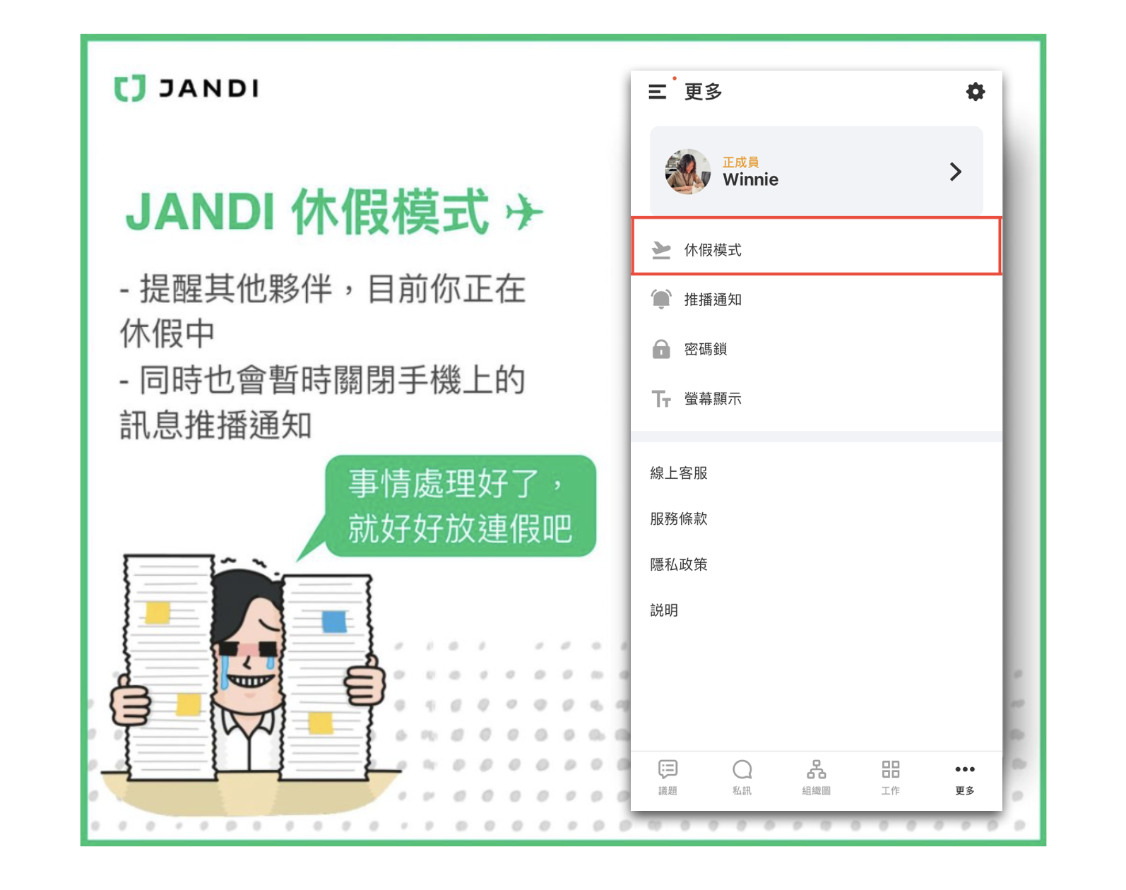 這時候 JANDI 的「休假模式」功能,可說是所有工作者的救星。因為每個人都可以在休假之前,在此功能設定休假的日期始末,系統會自動提醒其他成員你正在休假中;同時手機也會在休假時間內,暫時所有訊息的通知。