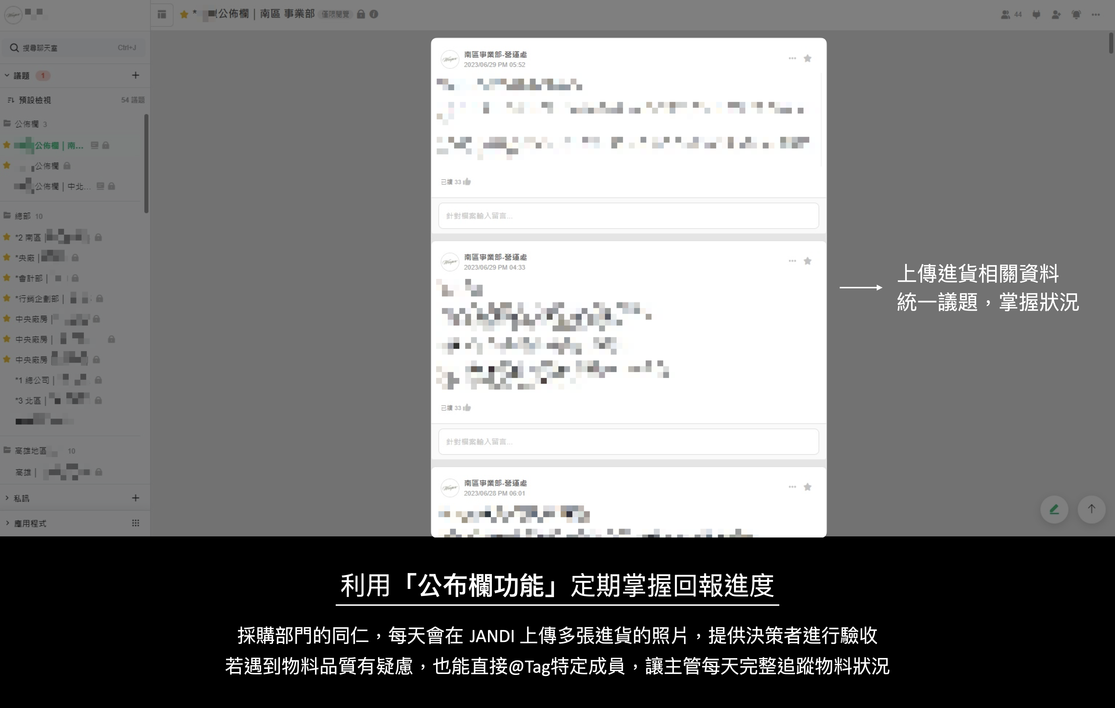 藉由 JANDI 設定專屬議題並邀請相關成員加入,蔡副總就發現過往一個群組夾雜各種不相關話題的情況不再發生,而且成員在工作中逐漸落實區分公私話題的界線。另外,像是採購部門的同仁,每天會在 JANDI 上傳多張進貨的照片,提供決策者進行驗收;若遇到物料品質有疑慮,也能直接 @Tag 特定成員,讓主管每天完整追蹤物料狀況,即使人不在加工生產中心也能掌握商品情況。