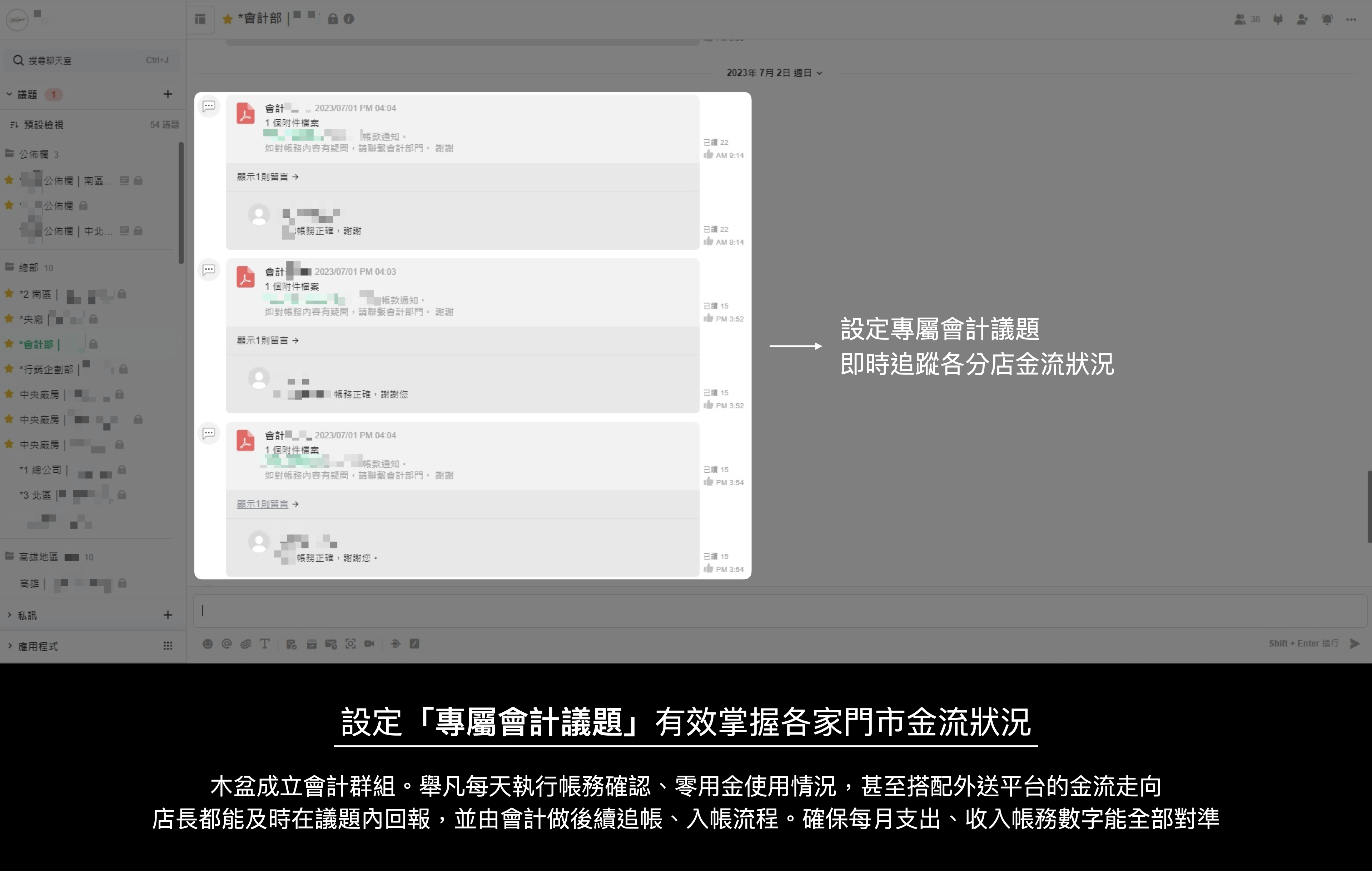 木盆現在每年平均產能可賣出 100 多萬份沙拉,為了有效掌握每家門市的銷售與金流狀況,木盆成立會計群組,邀請會計成員、各家門市店長、以及高階主管在此議題內。舉凡每天執行帳務確認、零用金使用情況,甚至搭配外送平台的金流走向,店長都能及時在議題內回報,並由會計做後續追帳、入帳流程,確保每月支出、收入帳務數字能全部對準。
