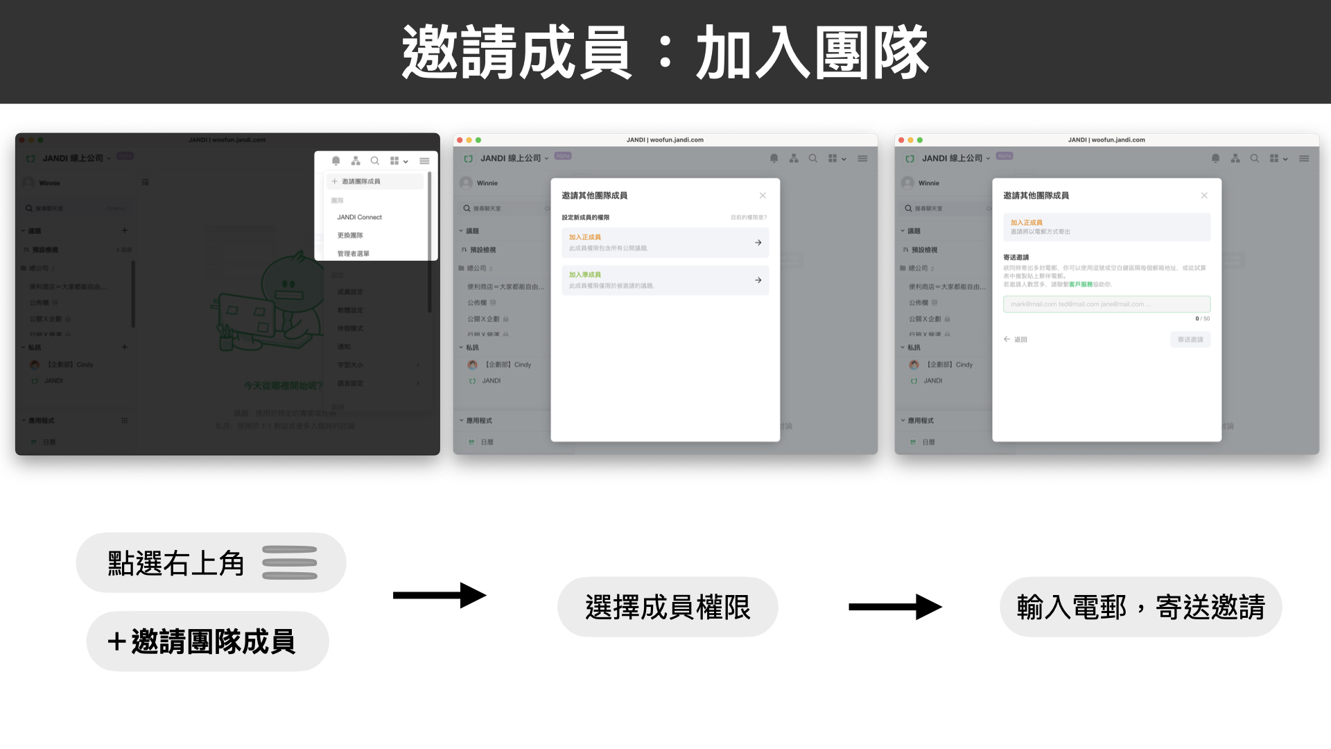 下一步展開「邀請」的流程,透過每位成員的 E-mail 帳號發送邀請通知,並根據不同成員的權責,協助他們以「準成員」的身分被分類到不同議題內。值得一題,木盆先鎖定直營門市夥伴加入 JANDI,相隔兩個月後再邀請加盟夥伴,讓系統搬遷過程更有秩序。