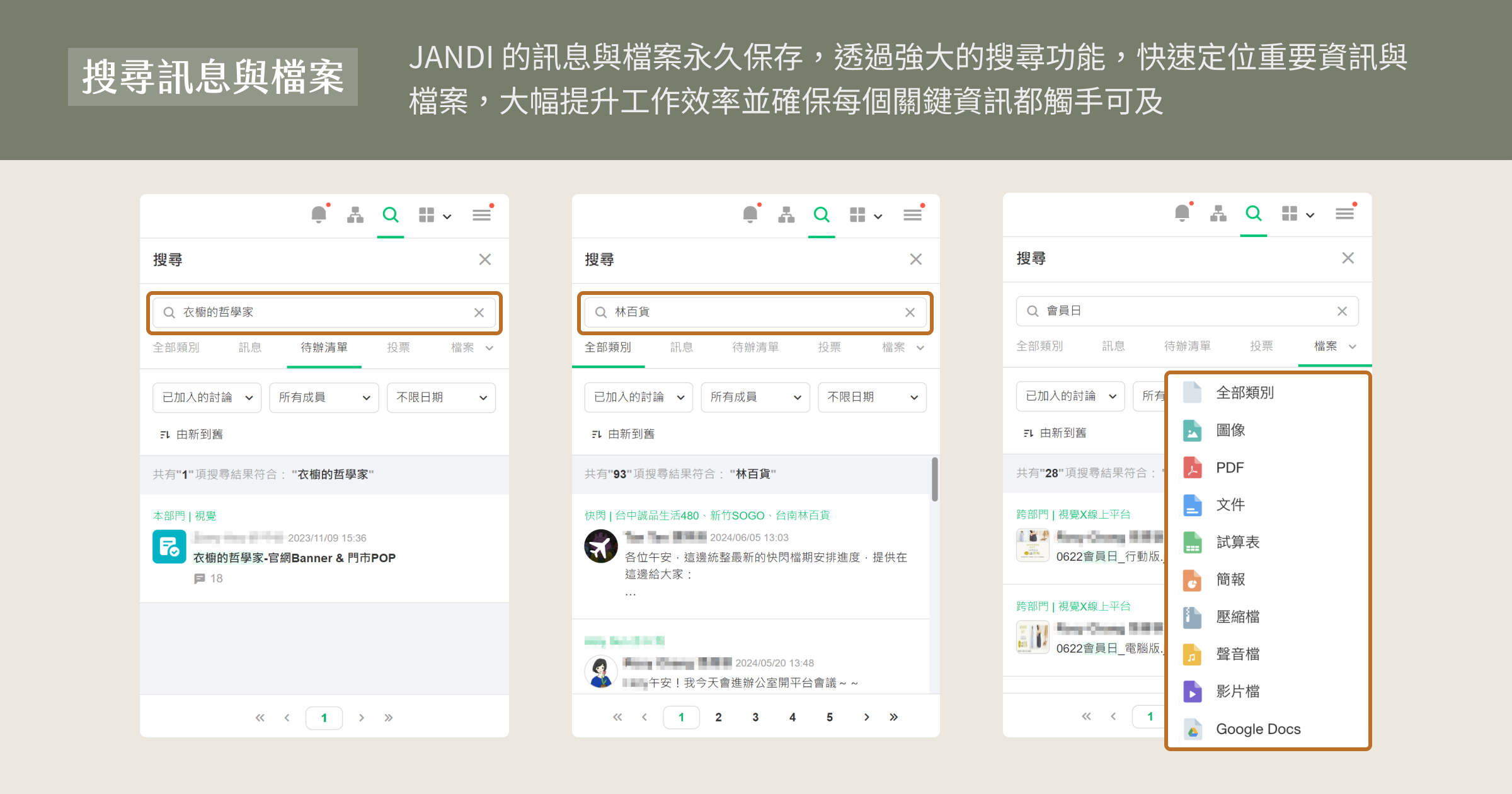 許許兒當時選擇 JANDI 的因素之一,目的為解決資訊散落各處導致訊息斷點問題。受惠 JANDI 可永久保存歷史紀錄(包含文字內容、檔案)讓既有員工或新加入的成員都能夠透過具備高度邏輯性的「搜尋」功能(包含可搜尋圖片檔名、全面/單一議題搜尋),幫助委外人員、接手的人都能快速進入狀況。例如:許許兒不定期推出快閃店,負責成員就能在「快閃專案」的議題內,追溯過去活動的內容、資料,讓每場活動的交接不再發生資訊遺漏,同樣的問題不用再次回覆,減少很多重複溝通的時間成本。