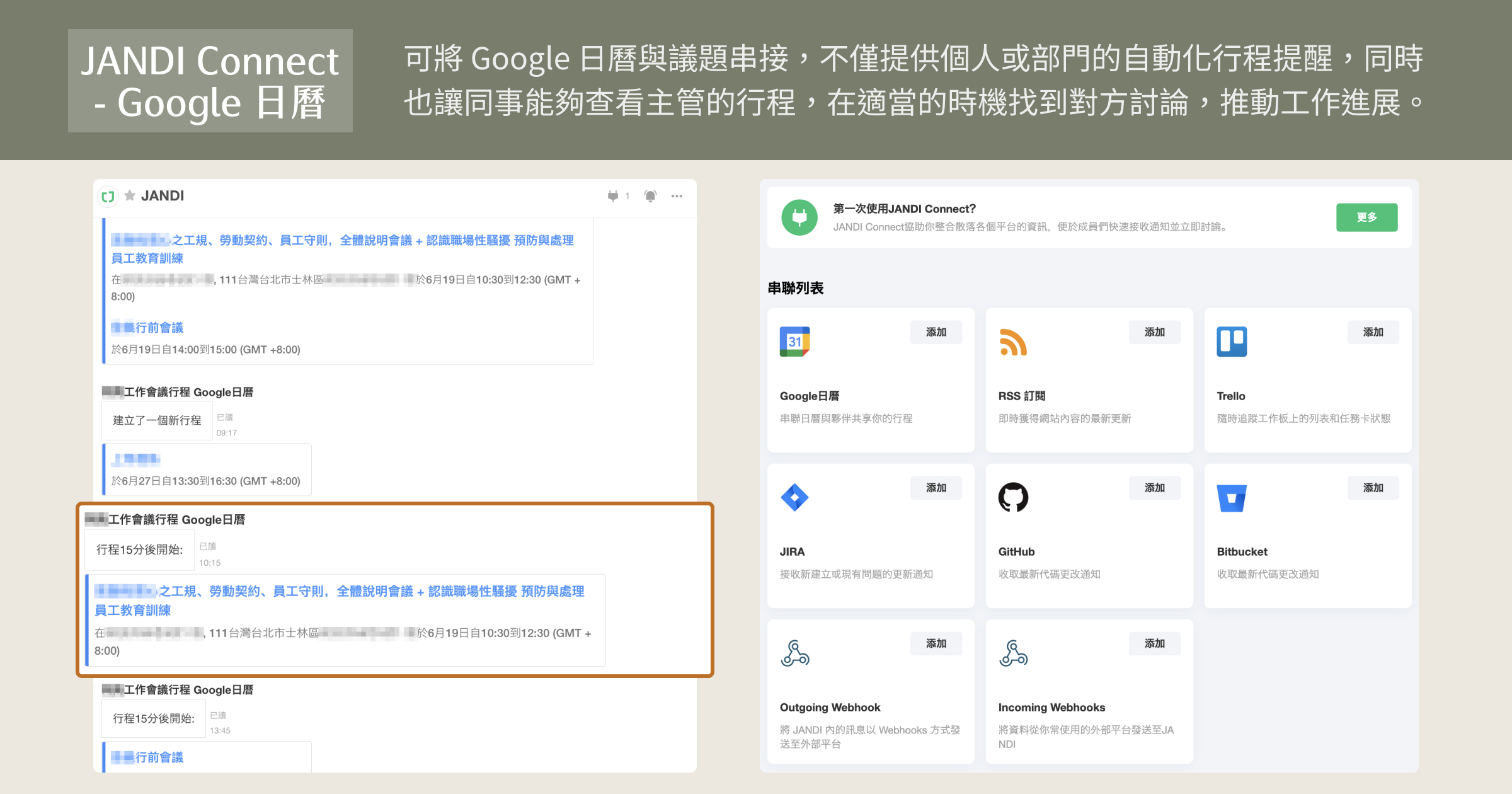 一間公司要能穩定運作,需要達成兩件事:第一、是員工能在對的時間點找到對的人;第二、是管理者能掌握團隊的工作進度。阿南就提到,JANDI Connect 可以串接 Google 行事曆到特定議題,對她有很大的幫助,不僅會自動跳出行前通知,建立新行程也有提醒,把同仁加進議題後,能幫助大家在對的時機找到她,降低雙方對行程安排的焦慮感與不確定性。