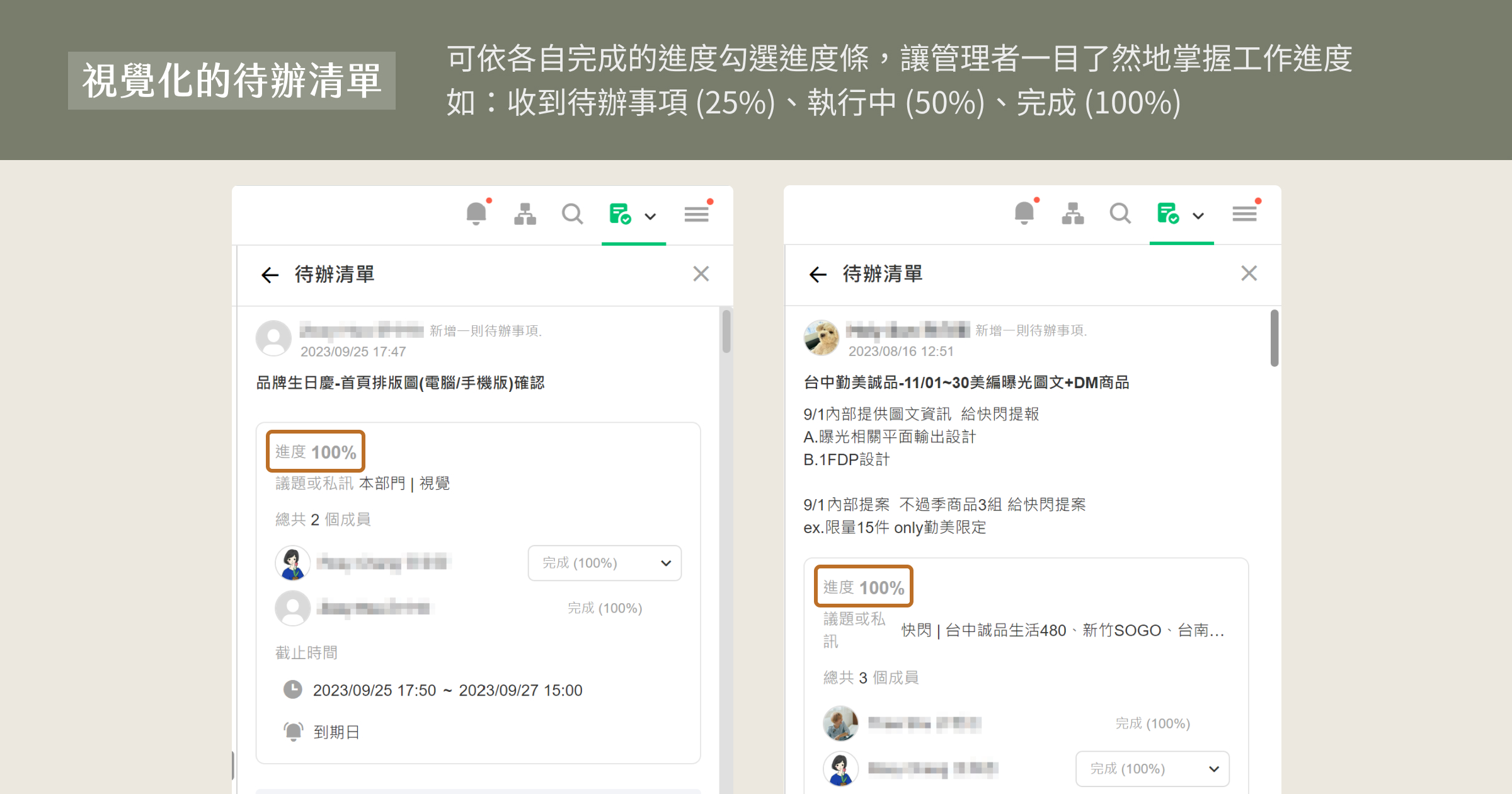 至於掌握員工的進度,阿南分享她的使用心得:「JANDI 有很多視覺化的小提醒,例如紅點、星號標示、以及待辦清單進度條,從 0%、25%一直到 100%階段,大家有感這個工具很好用。」
