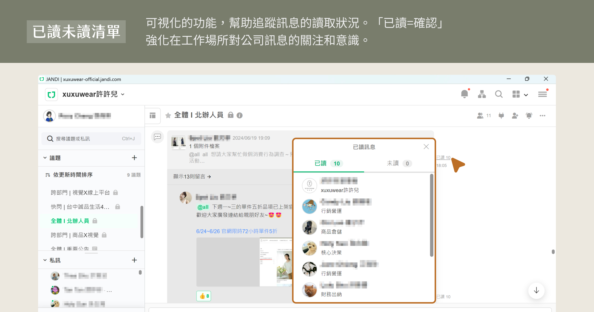 當初許許兒選擇 JANDI 的目的是希望改善團隊分散的工作溝通,在導入後,隨著管理者與員工使用 JANDI 越來越上手,許許兒團隊也發展出一套有別於以往的工作默契與規則。例如:管理層與同仁宣導訊息發布後「已讀=確認」的觀念,不需要多餘的動作,就能在無形中強化決策傳達的有效性。