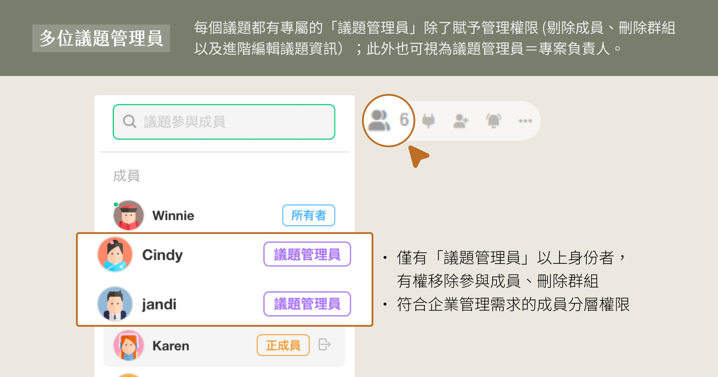 對外管理方面,JANDI 的每個議題賦予管理員的明確權限,因此許許兒可以主導規劃一致性的外部合作模式,不再因為工具限制去適應各家廠商的溝通習慣。阿南舉例「JANDI 好處是給予管理者能管控議題的一些細節,不像 LINE 群組每個人能隨意更改群組名稱、剔除人,甚至被刪除群組,這些功能對管理者真的幫助很大。」