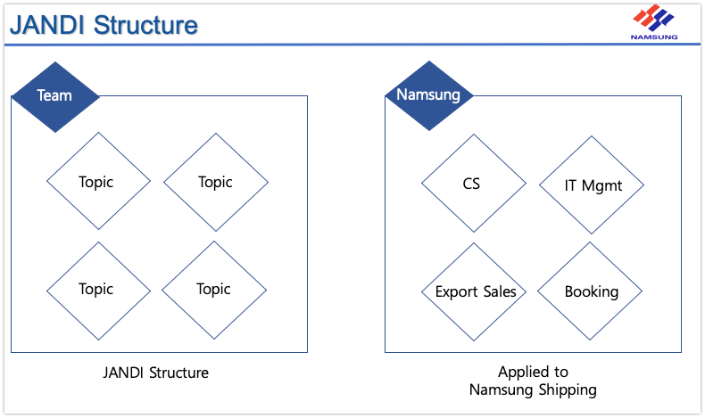 Để dễ dàng hiểu cấu trúc của JANDI, chúng tôi đã bảo họ nghĩ về nó như ‘Đội = Nam Sung Marines và Mỗi Chủ đề = Mỗi Phòng Ban. Ngoài ra, chúng tôi thu thập các chủ đề theo các phòng ban, văn phòng ở nước ngoài và các chi nhánh.
