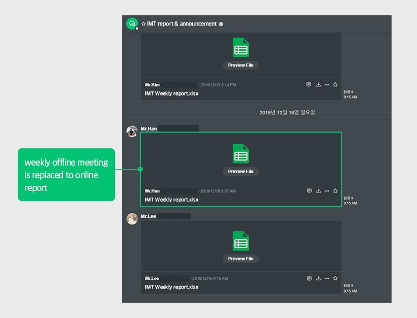 Chúng tôi xóa các cuộc họp trực tiếp để báo cáo hàng tuần. Người phụ trách thu thập báo cáo và tải nó lên JANDI. Ngoài ra, trước đây không thể xác nhận xem báo cáo đã được đọc hay chưa bởi mỗi thành viên. Tuy nhiên, vì nó có thể kiểm tra biên lai đọc, chúng tôi chia sẻ các báo cáo hàng tuần qua JANDI.