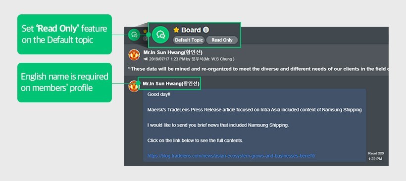 Đây là chủ đề xem Bảng mà bạn sử dụng làm chủ đề cho đăng tải các thông báo. Bởi vì Chủ đề mặc định, bắt buộc phải tham gia cho tất cả các Thành viên của nhóm, nên nó được sử dụng làm chủ đề thông báo. Vì chủ đề này đã được đặt thành Read- Only (Chỉ đọc), nên rất hữu ích khi gửi thông báo. Chỉ có quản trị viên có thể viết tin nhắn. Tất cả các thông báo và tên được viết bằng tiếng Anh.
