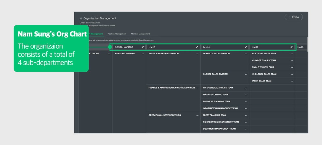 Nhóm Nam Sung bao gồm tổng cộng bốn tổ chức phụ. Thật thuận tiện để quản lý nhóm riêng biệt trong nước / quốc tế, các phòng ban và các chi nhánh.