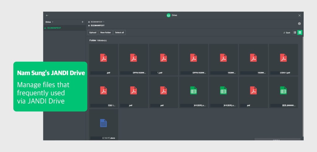 Chúng tôi không sử dụng ổ đĩa JANDI Drive trên toàn công ty. Nhưng một số địa điểm ở nước ngoài đang sử dụng nó tốt. Thay vì tải các tập tin lên các phòng trò chuyện, bạn sẽ dễ dàng xem qua chỉ bằng một cái liếc mắt nếu bạn đặt các tập tin vào một ổ đĩa để quản lý chúng.